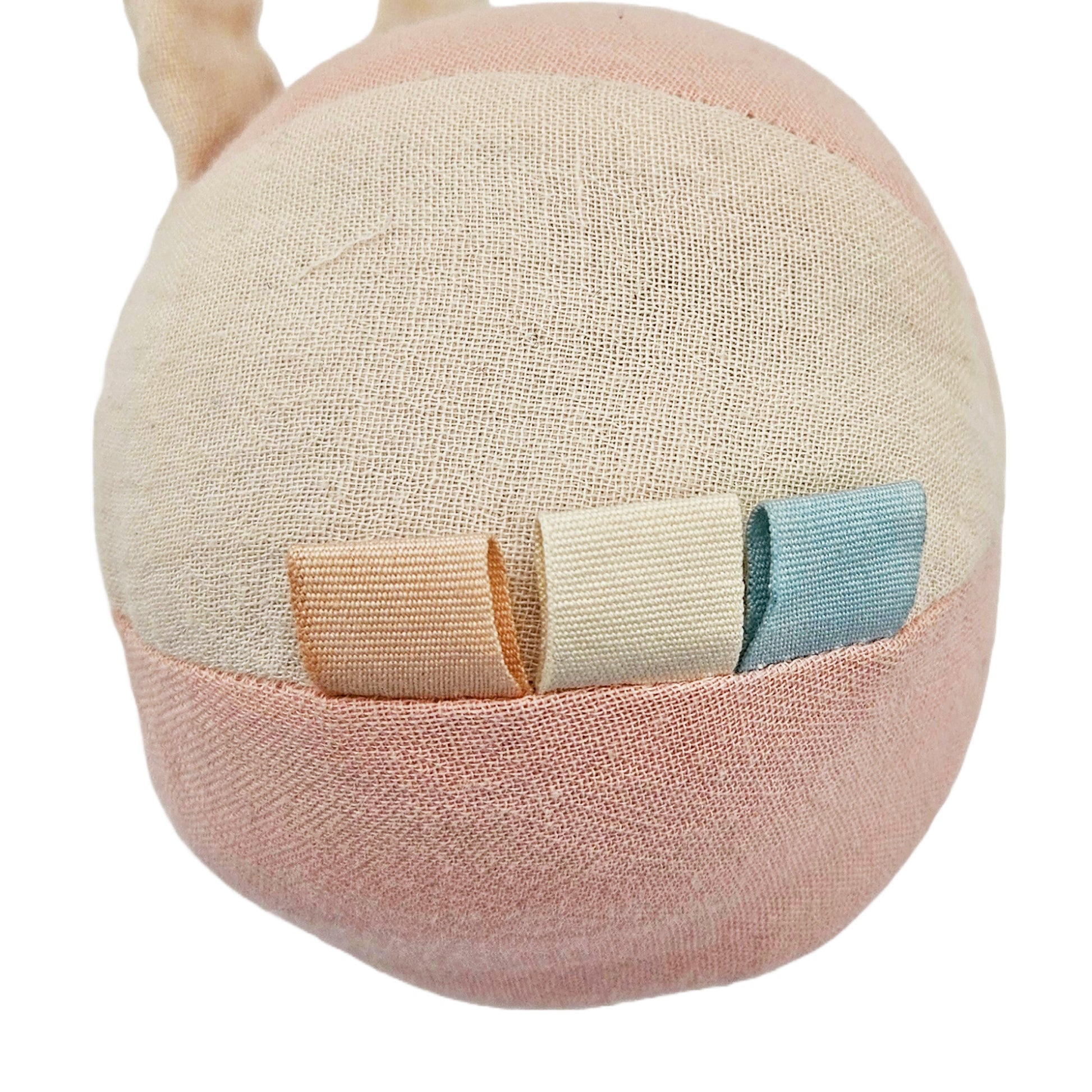 Bollskallran i färgen Sandshell är formad som en mjuk kanin med långa öron och små färgglada lappar som bjuder in till nyfiken lek. Inuti gömmer sig en pinglande skallra som ger ifrån sig ett mjukt ljud vid rörelse, perfekt för att fånga barnets uppmärksamhet.