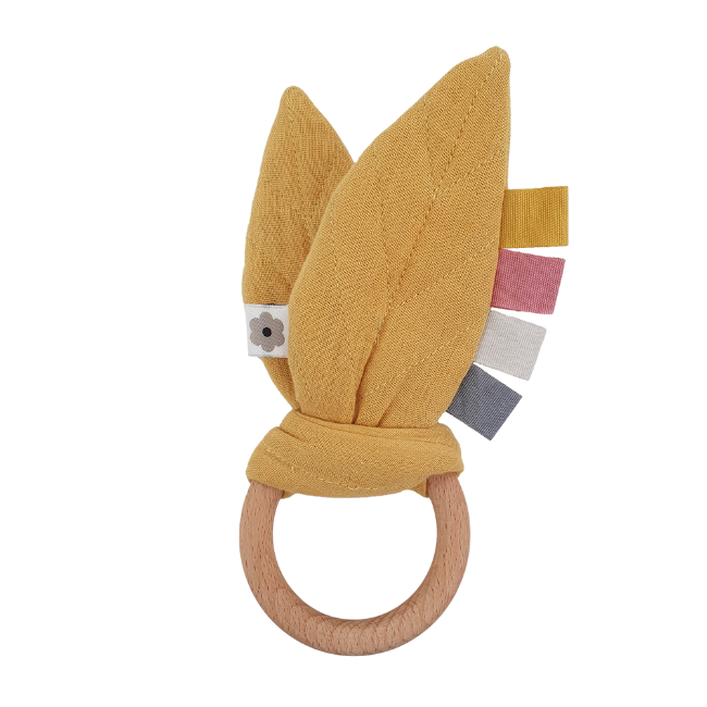De färgglada lapparna på bladen lockar till lek och greppträning, och den släta ringen i FSC-certifierat bokträ är perfekt formad för små händer.