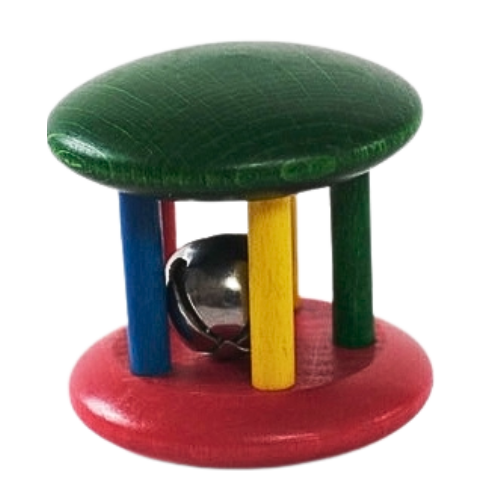En liten skallra med stor charm! Den här färgglada träskallran med bjällra lockar till lek med sitt mjuka klingande ljud och sin runda, greppvänliga form.